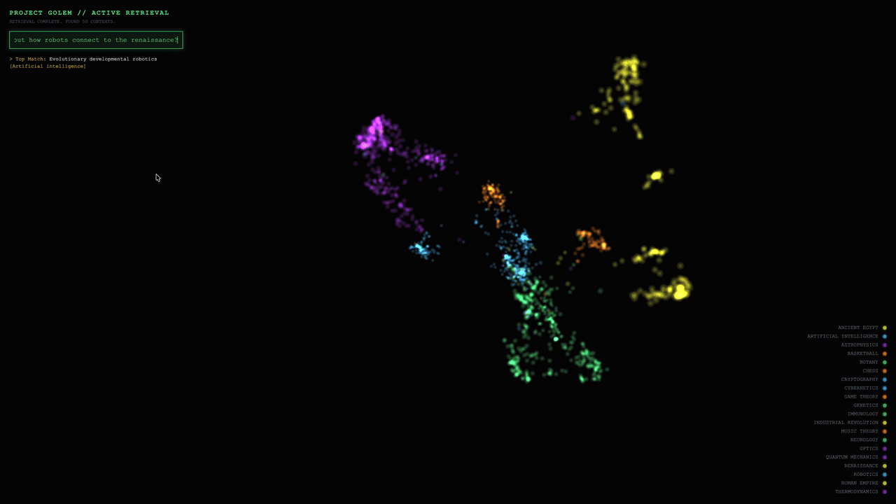 Project_Golem is a browser-based tool that lets you see the vector space your RAG system operates in. It takes the high-dimensional embeddings that drive retrieval — typically 768 or 1536 dimensions — and projects them into an interactive 3D scene you can explore directly.